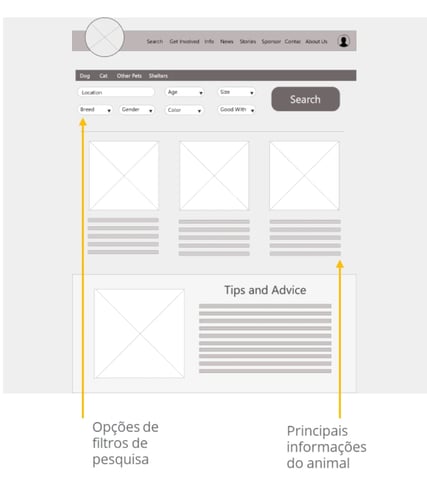 A arquitetura da informação foi cuidadosamente planejada para proporcionar uma navegação intuitiva, com um dashboard personalizado para adotantes acompanharem suas interações, favoritarem pets e acessarem conteúdo educacional direcionado às suas necessidades específicas.